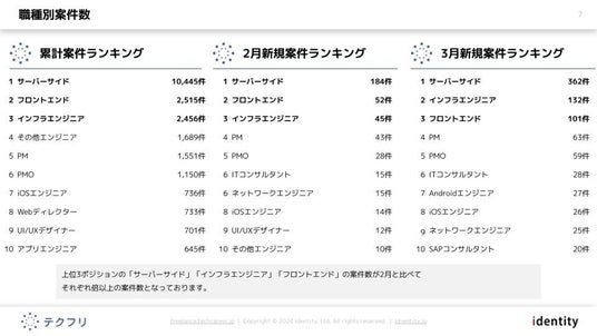 上位3ポジションの「サーバーサイド」「インフラエンジニア」「フロントエンド」の案件数が2月と比べて