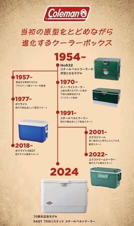 コールマンは、クーラーボックス発売70周年を記念するモデルとして、『54QT 70thリミテッド スチールベルトクーラー』を発売します。(2024年6月より順次発売予定)