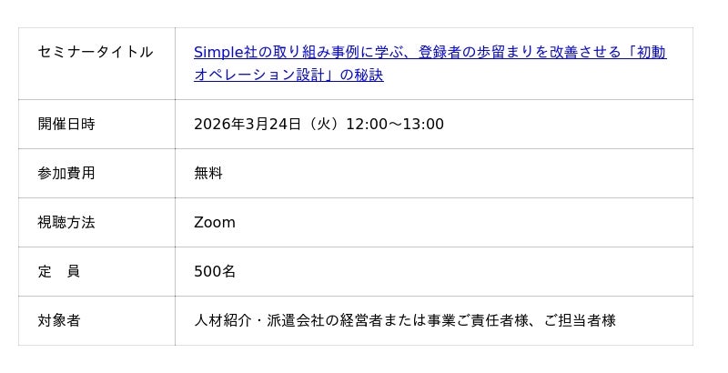 人材ビジネス向けマッチングシステムを提供するポーターズ株式会社(東京証券取引所グロース.証券コード5126、東京都港区、代表 西森 康二)は、Simple株式会社と共同で「Simple社の取り組み事例に学ぶ、登録者の歩留まりを改善させる初動オペレーション設計の秘訣」と題した無料セミナーを2026年3月24日(火)12:00~オンラインで開催いたします。