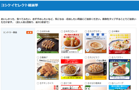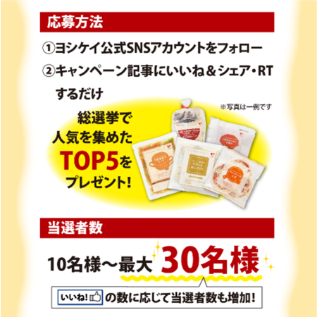 1.ヨシケイ公式SNSアカウントをフォロー2.キャンペーン記事にいいね&シェア・RTの2STEPで応募完了!対象者の中から抽選で、総選挙で人気を集めた上位5品を最大30名様にプレゼント!