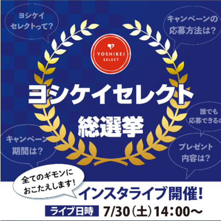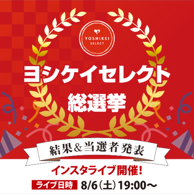 内容: 7月22日から開催された総選挙の結果発表ならびに当キャンペーンの当選者をライブで生発表します。またライブ中はコメント欄などで当選者と双方向コミュニケーションを図り他視聴者にもヨシケイの取り組みを紹介します。ツイッターのスペース機能でも同時配信し、当選者についてはツイッターでも拡散いただけるよう呼びかけを行います。