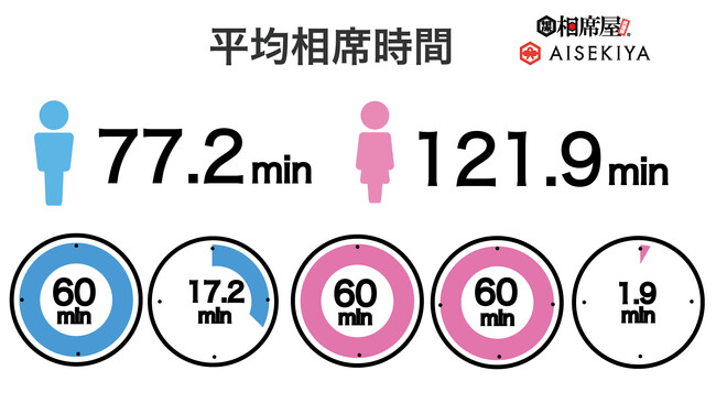 2023年5月の相席屋平均相席時間は男性は77.2分、女性は121.9分となりました。