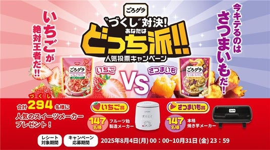 今回、同商品の再発売にあわせて、「ごろグラ“づくし”対決! あなたはどっち派!! 人気投票キャンペーン」を2025年8月4日から実施します。「ごろグラ」シリーズをお買い上げの上、「ごろグラ いちごづくし」と「ごろグラ さつまいもづくし」のいずれかお好きな商品に投票していただくと、SNS映えする“いちご飴”が作れる「フルーツ飴製造メーカー」、または、さつまいものおいしさを最大限に引き出す「本格焼き芋メーカー」が抽選で当たります。さらに、抽選に外れた方の中から294 (づくし) 名に「ごろグラ 詰め合わせセット」をプレゼントします。