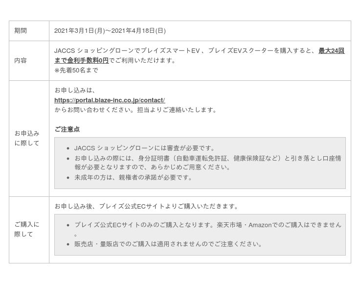 EVモビリティメーカーの株式会社ブレイズ(愛知県名古屋市、代表取締役:市川秀幸)は、2021年3月1日(月)~2021年4月18日(日)の期間、ブレイズスマートEVまたはブレイズEVスクーターをローンでご購入のお客様に対して、利息分をブレイズが負担する「ゼロ金利キャンペーン」をスタートします。