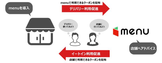 「街づくりmenu」とは新しいライフスタイルの定着など様々な理由により商店街へ足が遠のいている地域住民のニーズをデリバリー導入によって掴むことで、オンラインとオフラインの利用を循環させ販路を拡大していく仕組みの構築と、加盟店舗の売上増加を通じて持続的な街全体の活性化を目指すプロジェクトです。デリバリーと店舗の双方での利用を促すクーポンを発行し、地域住民の皆様が気軽に街の商品を楽しむことができる仕組みを整備。地域の皆さまと一緒に街の活性化を目指します。