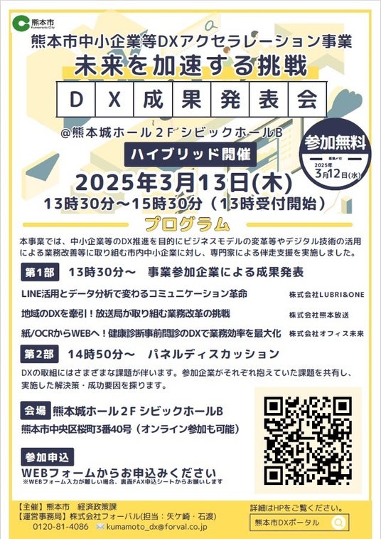 今回、約半年間の支援を受けられた市内中小企業の代表3社による成果発表として、「熊本市中小企業等DXアクセラレーション事業成果発表会~未来を加速する挑戦~」を開催いたします。