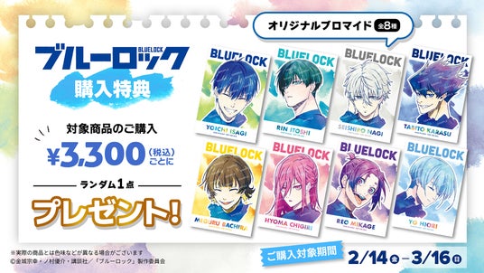 販売期間中(2025/2/14~2025/3/16)、TVアニメ『ブルーロック』キャンバス 対象商品を3,300円(税込)ご購入ごとに【 購入特典オリジナルブロマイド(全8種)】をランダムで1点をプレゼントいたします。