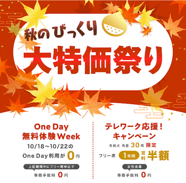 スタートアップと企業の第二創業を支援し、コワーキングスペース運営を行うfabbitは、フリー席の利用お申込みをいただいた方を対象に、最大1年間の賃料が半額になる「秋のびっくり大特価祭り」キャンペーンを開始します。