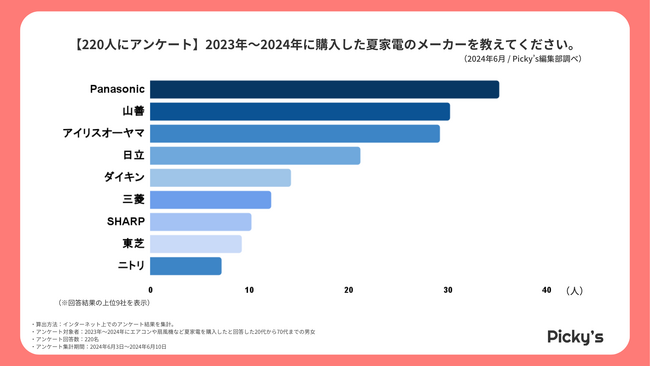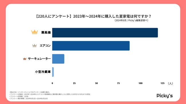 「Picky’s」は、インターネットショッピングにおいて、購入前に試せない・選ぶべきものがわからないという課題の解決を目標に、あらゆる商品のおすすめランキングや検証レビューを紹介するサイトです。このたびPicky’s(https://rentry.jp/)では、夏家電についてインターネット上でアンケート調査を行いましたので発表いたします。