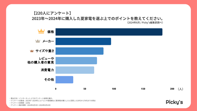 2023年~2024年に購入した夏家電のポイントで最も重視されたのは「価格」(182票)でした。