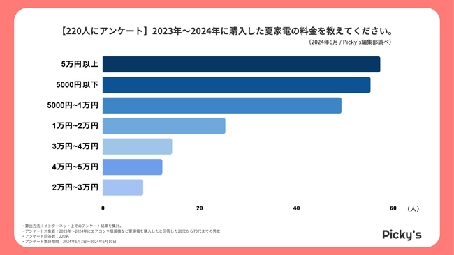 2023年~2024年に購入した夏家電の料金に関して、最も多かったのは「5万円以上」(57票)でした。