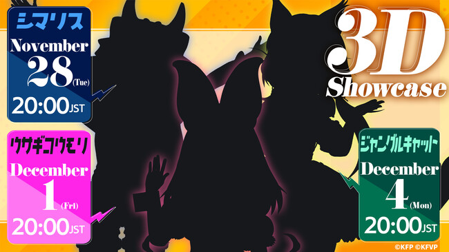 「けものフレンズプロジェクト」から登場し現在好評配信中のVTuber「けものフレンズVぷろじぇくと」。この度「シマリス」「ジャングルキャット」「ウサギコウモリ」の3D化が決定し、各Youtubeチャンネルにて、11月28日(火)にシマリス、12月1日(金)にウサギコウモリ、12月4日(月)にジャングルキャットがお披露目配信を実施予定。それぞれがゲストを招き、3Dを存分に活かした企画内容でお送りする。