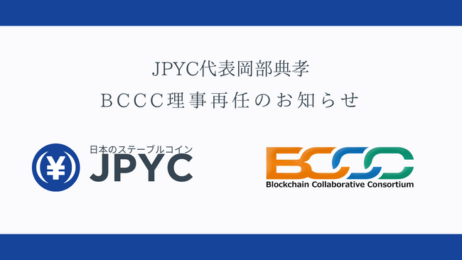 日本円連動ステーブルコイン『JPYC』を取り扱うJPYC株式会社(東京都千代田区、以下JPYC社)は、代表取締役の岡部典孝が一般社団法人ブロックチェーン推進協会(以下 BCCC)におきまして、理事選挙を経て、同協会の理事に再任したことをお知らせいたします。