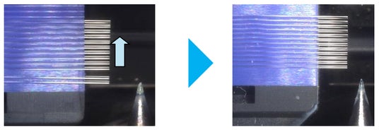 新型多心光ファイバ融着接続機「100R」には、「光ファイバ自動整列機能」を搭載しました。光ファイバをセットした際に、高精度で軸合わせをするためのV溝に載らなかった光ファイバを整列させる機能で、これにより光ファイバのセットのやり直しを減らし、作業時間を短縮します。