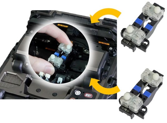ファイバホルダおよびV溝は、従来機同様に光ファイバの心数と光ファイバ間隔に応じたラインナップがあり、施工者自身が融着接続する光ファイバに応じて交換可能です。