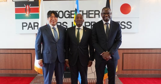 左から:Looop 代表取締役社長 CEO中村創一郎、駐日ケニア大使Mr. Moi Lemoshira、Bboxxケニア社 マネージングディレクターMr. Anthony Mabonga