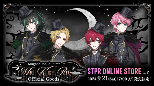 株式会社STPR(本社:東京都渋谷区、代表:柏原真人、以下:STPR)は、STPRが活動をサポートしているビジュアル系2.5次元歌い手グループ「Knight A - 騎士A -」の秋グッズ、Knight A - 騎士A - 2024 Autumn “Mid-Knight Party”オフィシャルグッズを解禁し、9/21(土)17:00より、STPR ONLINE STOREにて受付を開始することをお知らせいたします。