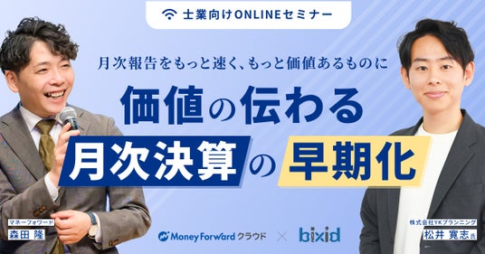 経営判断の“次の一手”を加速させる経営支援クラウド『bixid(ビサイド)』を提供する株式会社YKプランニング(本社:山口県防府市、代表取締役社長:岡本辰徳)は、株式会社マネーフォワード(本社:東京都港区、代表取締役社長グループCEO:辻庸介)との共催で、会計事務所向けに「~月次報告をもっと速く、もっと価値あるものに~価値の伝わる月次決算の早期化」セミナーを7月3日(木)14時よりオンライン開催いたします。