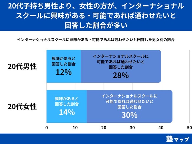 インターナショナルスクールに興味がある・可能であれば通わせたいと回答した割合を男女別でみてみますと、女性が(興味がある)14%・(通わせたい)30%、男性が(興味がある)12%・(通わせたい)28%という結果になりました。