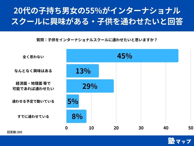 20代の男女を対象とした「子供をインターナショナルスクールに通わせたいと思いますか?」というアンケートで最も多かった回答は「全く思わない」で45%でした。
