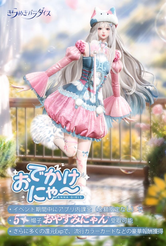 『おでかけにゃ~』イベント期間内にアプリ内課金をすると、ボーナスで☆5帽子・おやすみにゃんをプレゼント!(金額指定なし)。さらに多くの還元Exp獲得で、流行カラーカードなどの豪華報酬も受け取れます。この機会をお見逃しなく!