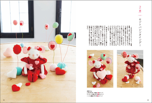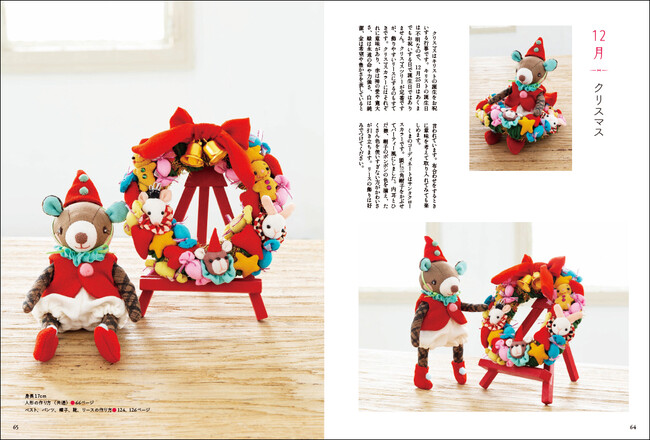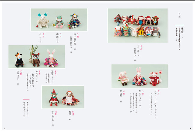 着せ替えできる動物たち、道具と材料/1月 十二支、辰の作り方/2月 セントバレンタインデー(ねずみの女の子)、ワンピースとくつの作り方/3月 ひなまつり(うさぎの女の子)、着物の各部分の名称、袷の着物の作り方、うさぎびなの作り方/4月 花あそび(ひつじの女の子)/5月 端午の節句(犬の男の子)、作務衣の作り方/6月 梅雨(カエル)/7月 七夕(ねずみの男の子)/8月 夏祭り(うさぎの女の子)、単衣の着物の作り方/9月 お月見(たぬき)、お団子の作り方、とっくりの作り方、お面の顔の描き方/10月 ハロウィン(ねこの女の子)/11月 紅葉(犬の女の子)/12月 クリスマス(くま)/人形の作り方、作品の作り方
