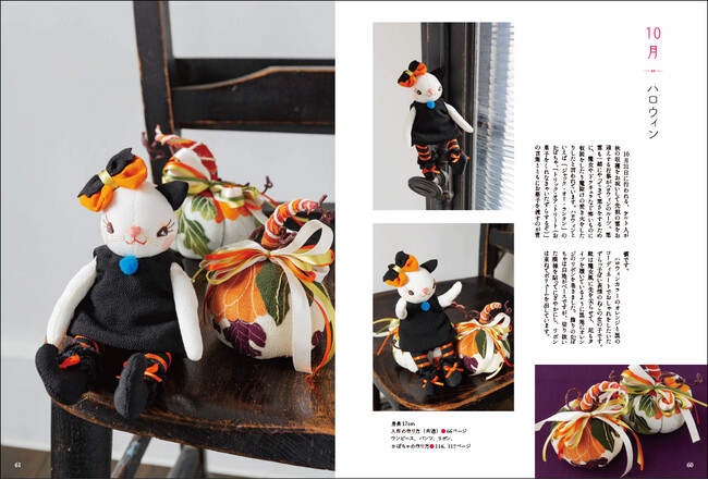 ハロウィンのかぼちゃ、クリスマスリースなど、人形といっしょに飾る季節のかわいい布小物の作り方もすべて掲載しています。