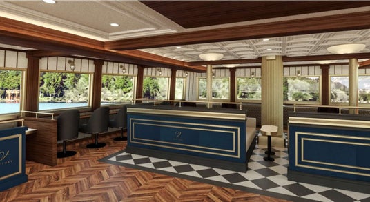 お客さま一人ひとりが心地よい豊かな船旅をお楽しみいただけるように、様々なタイプの座席を設けるほか、イギリスの伝統的な家具を配置するなどイギリスの文化と伝統を感じられる造作にもこだわります。海賊船乗船口、エントランス部の船内ショップはバーカウンターを意識した、落ち着いた雰囲気のカフェコーナーへリニューアルします。