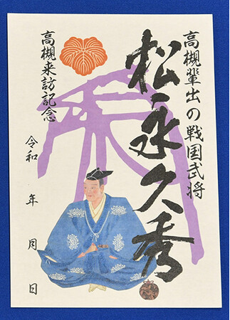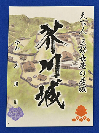 背景はアプリ「AR芥川城」で城をCG復元した図をデザインに採用。三好長慶の家紋「三階菱に釘抜」と松永家の家紋とされる「蔦紋」をあしらっている。