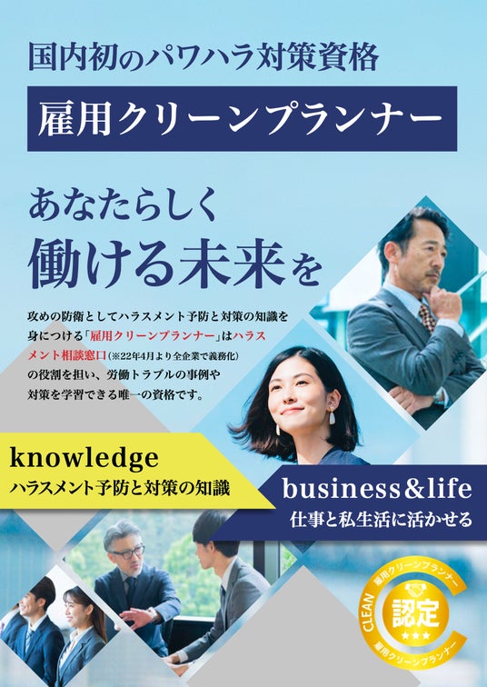 ハラスメントと労働トラブルを学べるのは雇用クリーンプランナーだけです。「トラブルにおいて何が問題になるのか」という事例や正しい対応策を身につけることで一生使える知識が身につきます。
