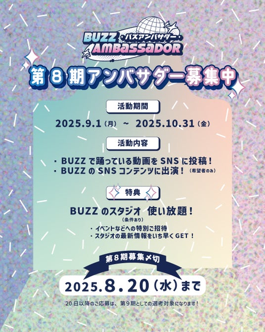 新たに選出された第7期BUZZアンバサダーたちは、STUDIO BUZZの魅力やブランド価値の向上、ダンスという素晴らしいカルチャー・エンターテインメントのさらなる発展を共創してまいります。