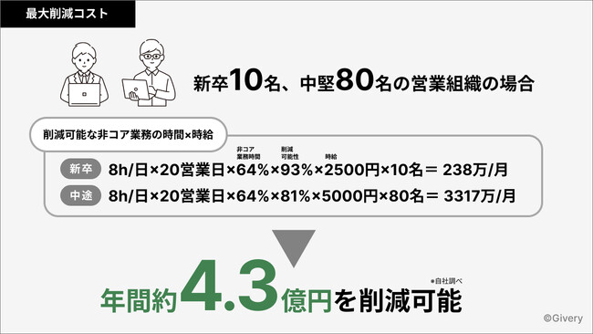 営業アシスタント機能を用いて削減可能な非コア業務の人的コストを算出すると、新卒10名、中堅80名の営業組織の場合、毎月約3,500万円にのぼり、これを年間で計算すると約4.3億円が削減可能であると考えられます。
