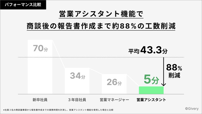 ▲従来は、商談後の報告書作成まで、新卒社員は70分、3年目社員は34分、営業マネージャーは26分かかり、平均では約43.3分かかっていました。