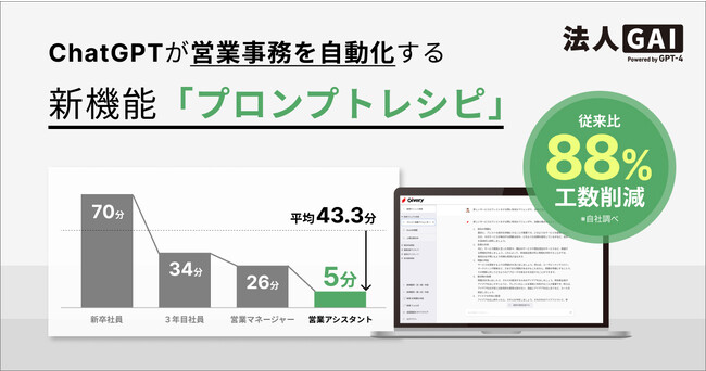 法人向けのChatGPT活用プラットフォーム「法人GAI Powerd by GPT-4」(以下:法人GAI)および、行政GAI Powerd by GPT-4(以下:行政GAI)、AIチャットボット、AI-FAQなどの業務自動化ソリューションを提供する株式会社ギブリー(本社:東京都渋谷区、代表取締役社長:井手高志、以下ギブリー)は、「法人GAI」のオプションとして具体的な業務シーンに対応した指示をワンクリックで可能とする「プロンプトレシピ」の提供を開始したことをお知らせします。