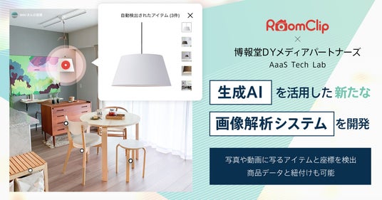 ルームクリップ株式会社(本社:東京都渋谷区、代表取締役CEO:高重正彦、以下、ルームクリップ)と株式会社博報堂DYメディアパートナーズ(本社:東京都港区、代表取締役社長:矢嶋弘毅、以下、博報堂DYメディアパートナーズ)の研究開発プロジェクトAaaS Tech Labは、OpenAI社やMeta社などが開発・公開している複数のAIモデルを組み合わせ、写真や動画に写っている物体とその座標を検出する画像解析システムを開発しました。大規模言語モデル(LLM)と画像を物体ごとにセグメンテーションするAIモデルを組み合わせることで、従来の同様のシステムに比べて、検出したい物体をより柔軟に指定でき、写真内の座標や具体的な商品などの付加情報も合わせて取得できる仕組みを実現しました。
