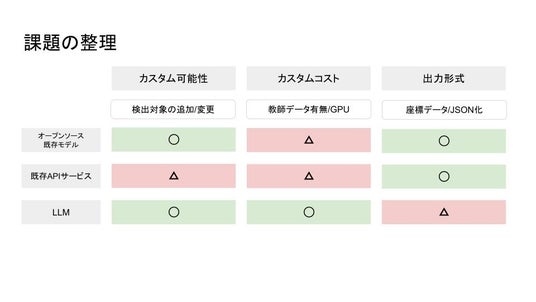 従来の同様の座標を取得できる画像解析システム(下図の「オープンソース既存モデル」「既存APIサービス」)では、検出したい物体について同様の物体の画像を予めAIに大量に読み込ませて学習させることなどが必要でした(カスタムコスト△)。一方で、言語によって検出したい物体を指定するシステム(LLM)では、写っているかどうかの判定は可能なものの、画像内のどこに写っているのかの座標情報を取得することはできませんでした(出力形式△)。