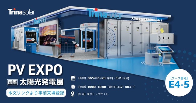 【2024年2月28日~3月1日/東京】太陽光発電およびスマートエネルギーのトータルソリューションを提供する世界有数の企業Trina Solar Co., Ltd.(SH:688599)(以下「トリナ・ソーラー」または「同社」)は、東京ビッグサイトにて開催される「PV EXPO【春】~第18回 【国際】太陽光発電展~」に出展いたします。
