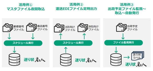 【図2】送り状名人新機能活用例:夜間のマスタファイル取込や、出荷予定ファイルから自動で取り込み、送り状ラベルを発行するなど、業務効率の向上、省力化に役立つ