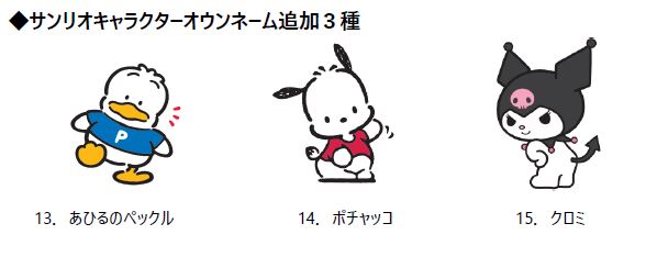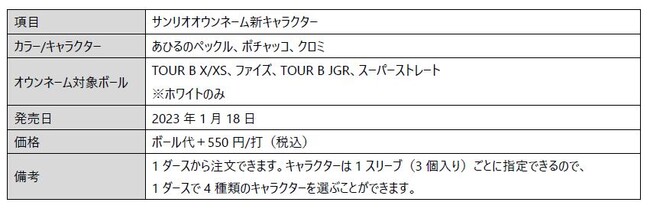 『サンリオキャラクターオウンネーム』は、対象のゴルフボールに好きなサンリオキャラクターをプリントできる有料サービスで、このたび取り扱いキャラクターを3種類追加いたします。サンリオキャラクター大賞においても近年上位にランクインし再注目される「あひるのペックル」「ポチャッコ」に、日本国内だけでなく海外においても人気を誇る「クロミ」の 3種類のキャラクターを追加して展開します。1ダースにつき4種類までキャラクターを選んで注文することができる※2 ため、自分好みにカスタマイズしたボールで、お客様がより一層ゴルフを楽しんでいただけるオウンネームサービスです。