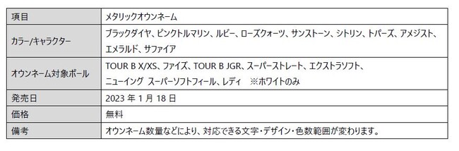 ブリヂストンスポーツ株式会社は、ゴルフボールのオウンネームサービス※1を拡充し、当社初となる「メタリックオウンネーム」と好評の「サンリオキャラクターオウンネーム」への取り扱いキャラクターの追加を2023年1月18日から開始します。
