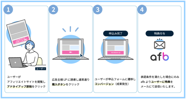 「アドタイアップ」を利用いただくと、フォーイットが特典送付やユーザー問い合わせなどの管理を代理で行うことができるため、手間をかけずにアフィリエイトサイトとのタイアップが可能となります。(※特典は現状、Amazonギフト券のメール配信となります。)