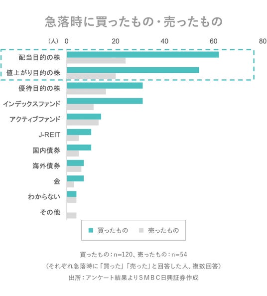 ・急落時に買ったもの・売ったものは何かを聞いたところ、「配当目的の株」「値上がり目的の株」がトップ2