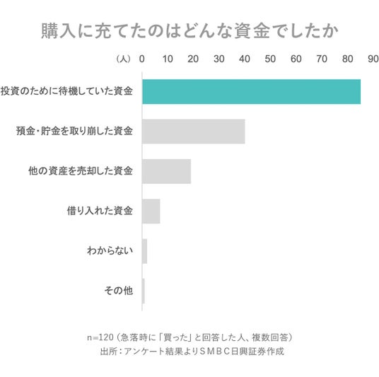 ・「資産を買った」と答えた方にその財源をお聞きしたところ、「投資のために待機していた資金」と回答した人が約7割に上った