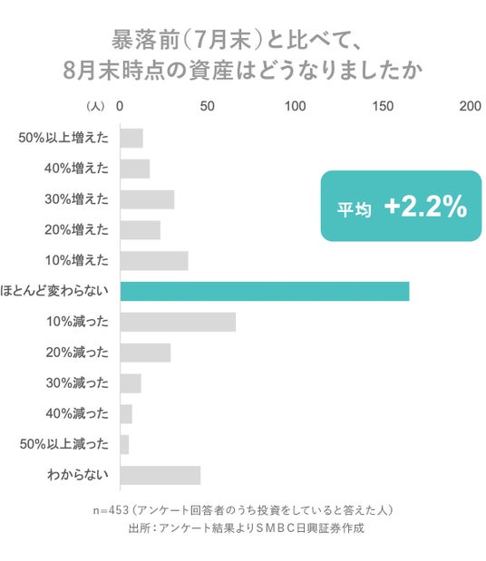 ・急落前(7月末)と比べて8月末時点の資産残高がどう変化したかをお聞きしたところ、「ほとんど変わらない」と答えた人が最多。一方で、全体では+2.2%とむしろ増えていた