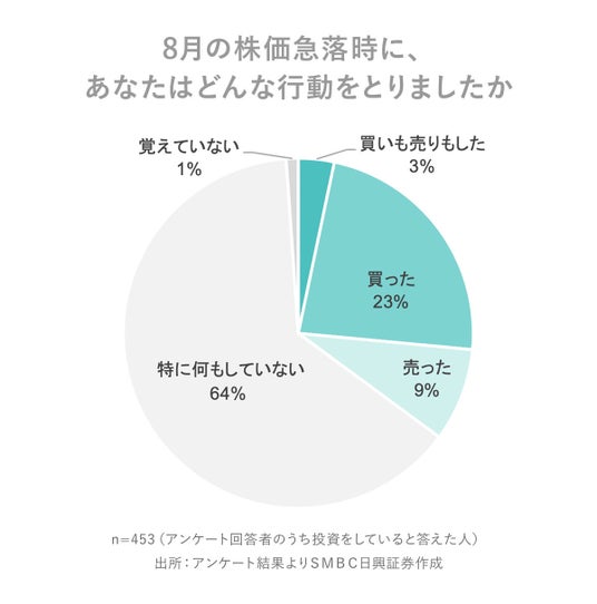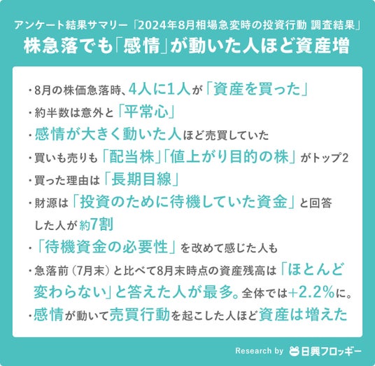 SMBC日興証券株式会社は、記事から株が買える投資情報サービス「日興フロッギー」(https://froggy.smbcnikko.co.jp/)を調査主体として、「2024年8月相場急変時の投資行動調査」を実施いたしましたので、その結果をご報告いたします。