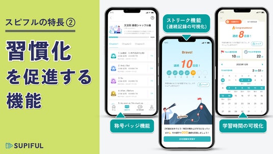 『スピフル』では、当社の英語コーチングサービス『プログリット』のノウハウを活かした習慣化促進機能を搭載しています。