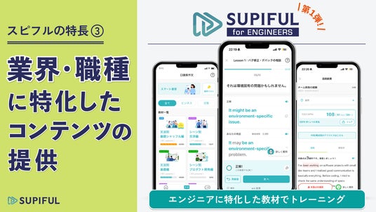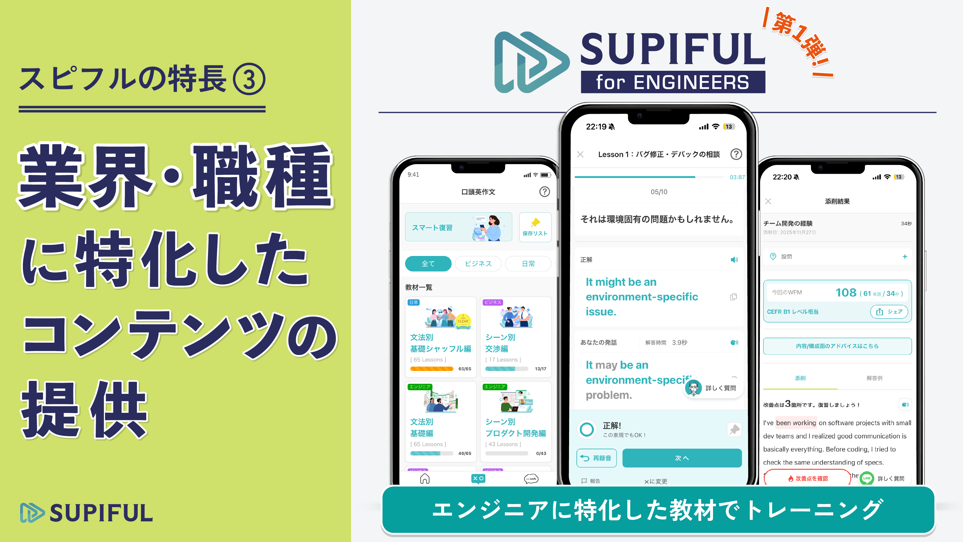 2025年12月には、業界・職種特化コンテンツの第1弾として、Jenkins開発者・川口耕介氏監修のエンジニア専用教材『スピフル for エンジニア』を提供開始いたしました。仕様説明やコードレビュー、設計議論、スクラムイベントでのディスカッションなど、リアルな開発現場を想定した例文・スピーチテーマでトレーニングが可能です。