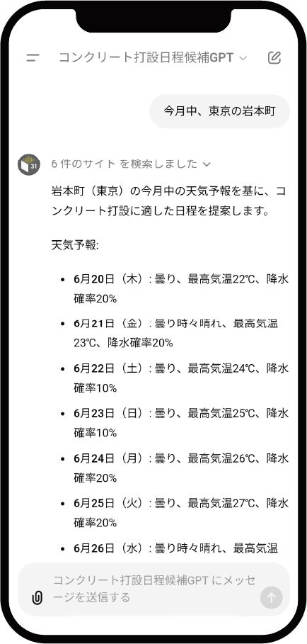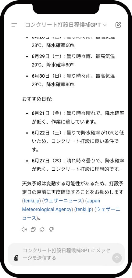 「コンクリート打設日程候補GPT」スマートフォン画面2.