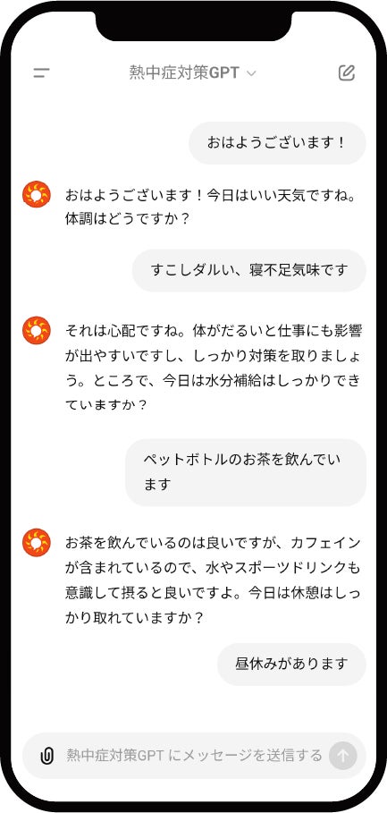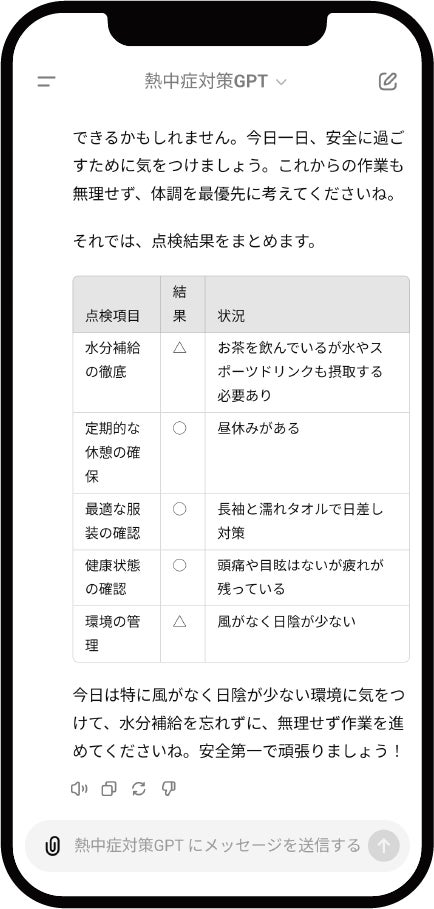 自然な対話のなかで、ヒアリングによる熱中症対策点検を行い、結果を表形式で表示します。音声対話でもやりとりすることができ、現場で気軽に体調チェックすることが可能です。
