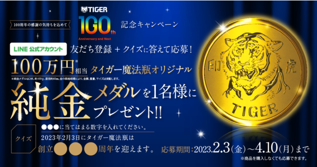 タイガー魔法瓶LINE公式アカウントを友だち登録&クイズに答えると、抽選で限定1名様に100万円相当の純金メダルをプレゼント。メダルはタイガー魔法瓶の初代ロゴマークである勇ましい虎をデザインし、100周年の感謝の想いを込めました。